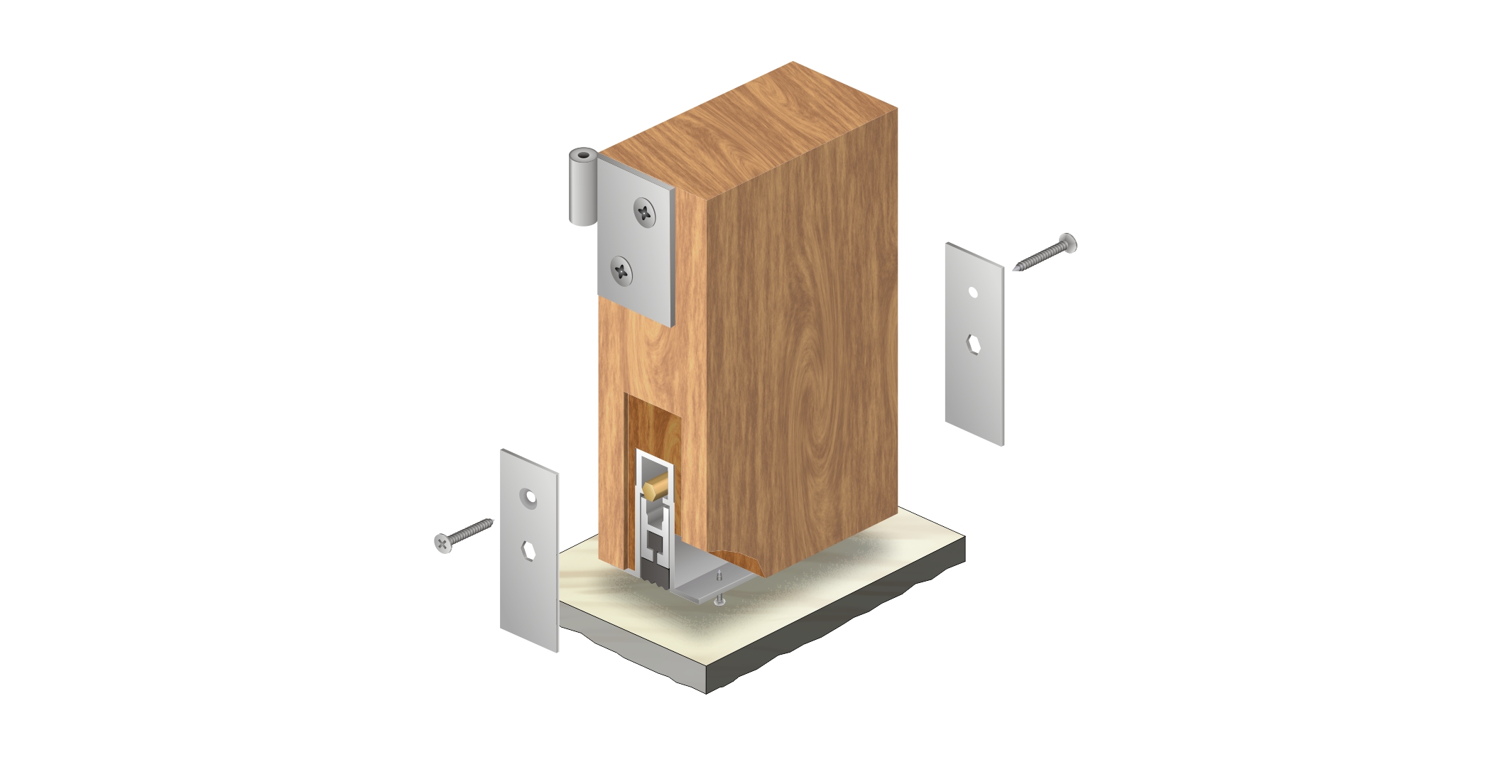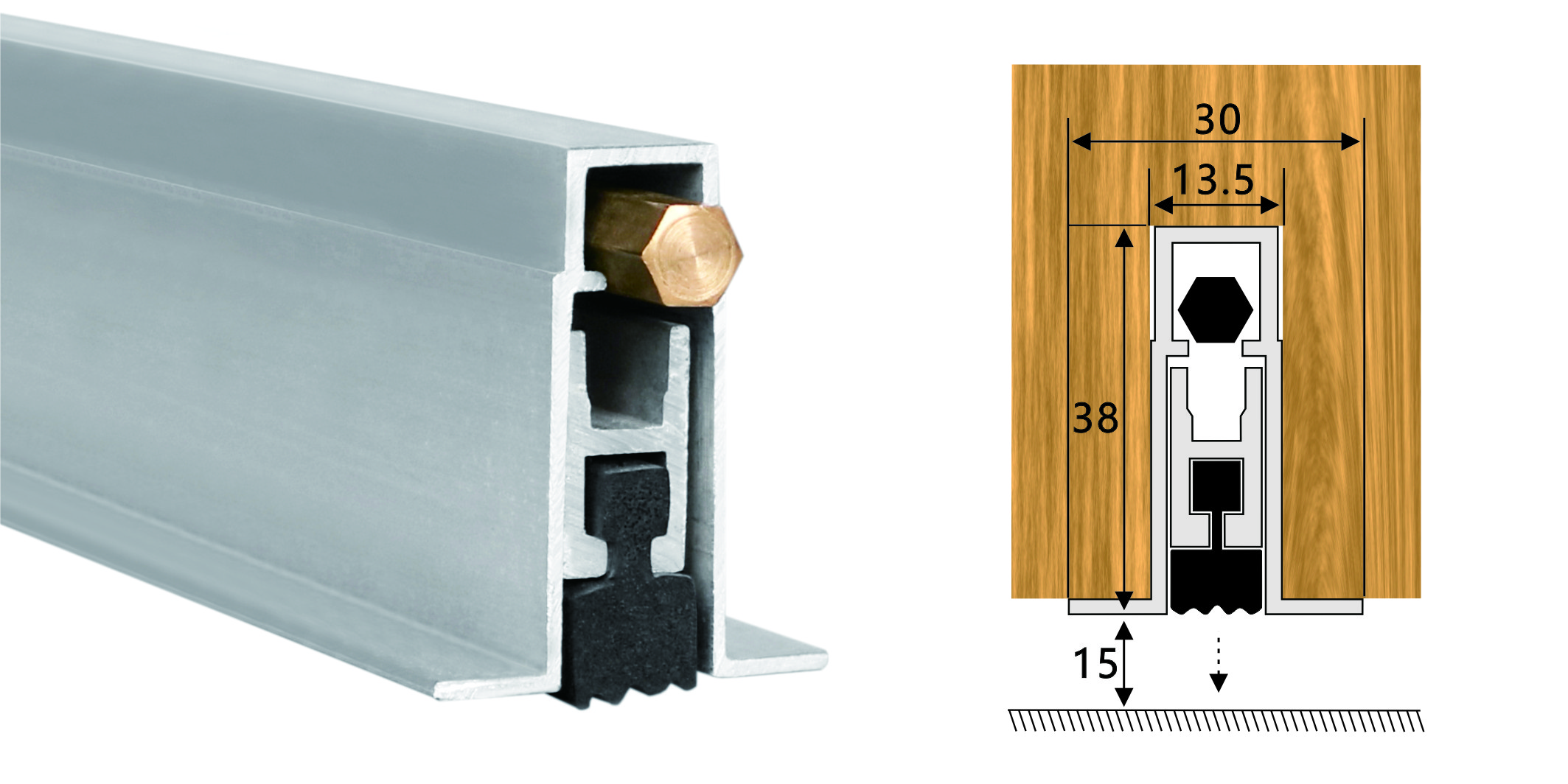 嵌入式門底自動升降式密封器,M型彈簧結(jié)構(gòu),適用于門扇內(nèi)開槽的門。安裝時需在門底有一個38mm*13.5mm的通槽,將產(chǎn)品放置其中,從產(chǎn)品的翼上固定,并將裝飾端蓋板用螺絲裝上,使用本產(chǎn)品不影響門的整體風格。