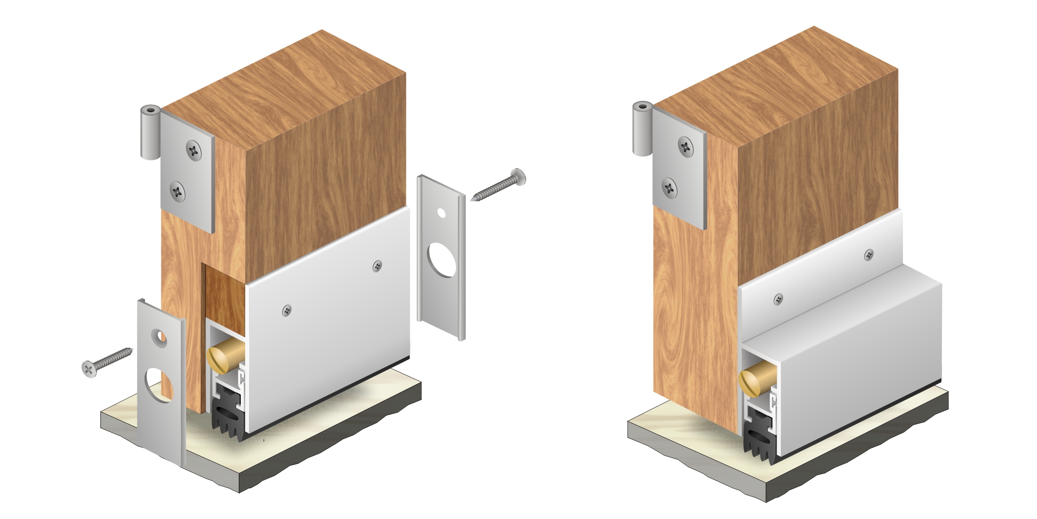 為重型門而設計,可半嵌式安裝或外裝,調節鈕有在右側或左側之分,可以適應右開門或左開門,多用于工礦企業對隔音要求高的門。半嵌入式安裝需在門底預留44mm高度,將產品放置其位,用螺釘在翼上固定。