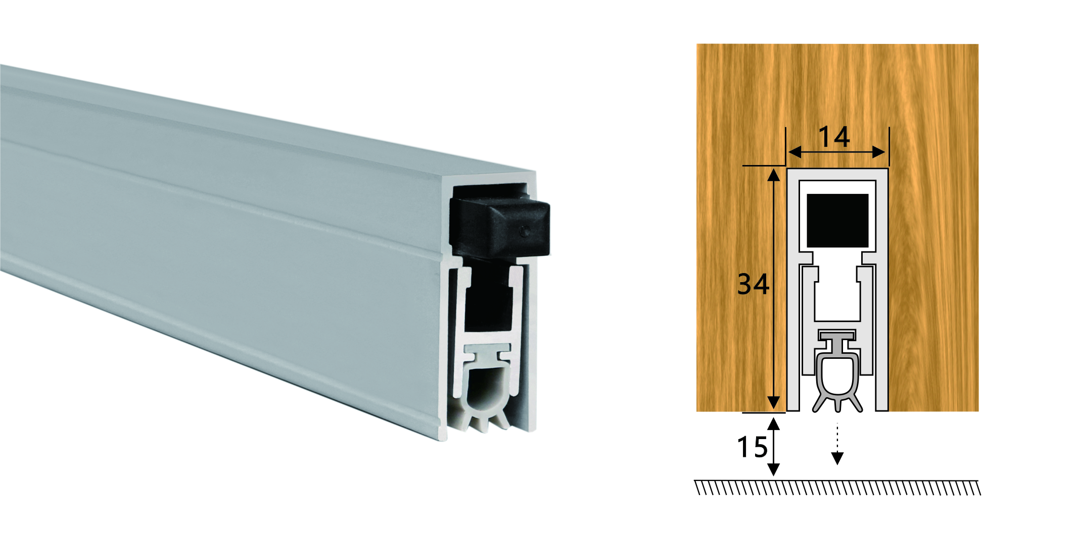 嵌入式門底自動升降式密封器,M型彈簧結(jié)構(gòu),適用于門扇內(nèi)開槽的門。安裝時需在門底有一個34mm*14mm的通槽,將產(chǎn)品放置其中,將兩端蓋板和密封器用螺絲固定,使用本產(chǎn)品不影響門的整體風格。